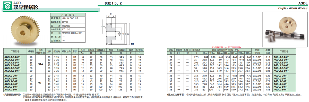 〔注 1〕 AGF、AG 蝸輪的輪轂材料是 FC200。AG 蝸輪主要是與 SWG 蝸桿配套。但是,模數(shù) m0.8 以下時(shí),與 KWG 蝸輪系列配對(duì)使用。