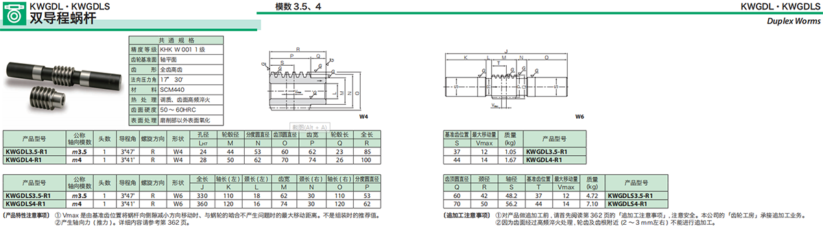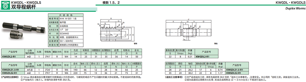 在小型機(jī)構(gòu)中要想實(shí)現(xiàn)高減速比及高轉(zhuǎn)矩,最簡(jiǎn)單的方法就是使用蝸輪系統(tǒng)。KHK 的標(biāo)準(zhǔn)蝸桿蝸輪產(chǎn)品,模數(shù)從0.5 ~6,減速比1/10~1/20,備有各種材料及形狀。另外,齒隙量非常小及可以獲得高精度旋轉(zhuǎn)的雙導(dǎo)程蝸桿蝸輪也列入了標(biāo)準(zhǔn)產(chǎn)品的行列中,敬請(qǐng)選用。各種 KHK標(biāo)準(zhǔn)蝸桿蝸輪的特長(zhǎng)列于下表。